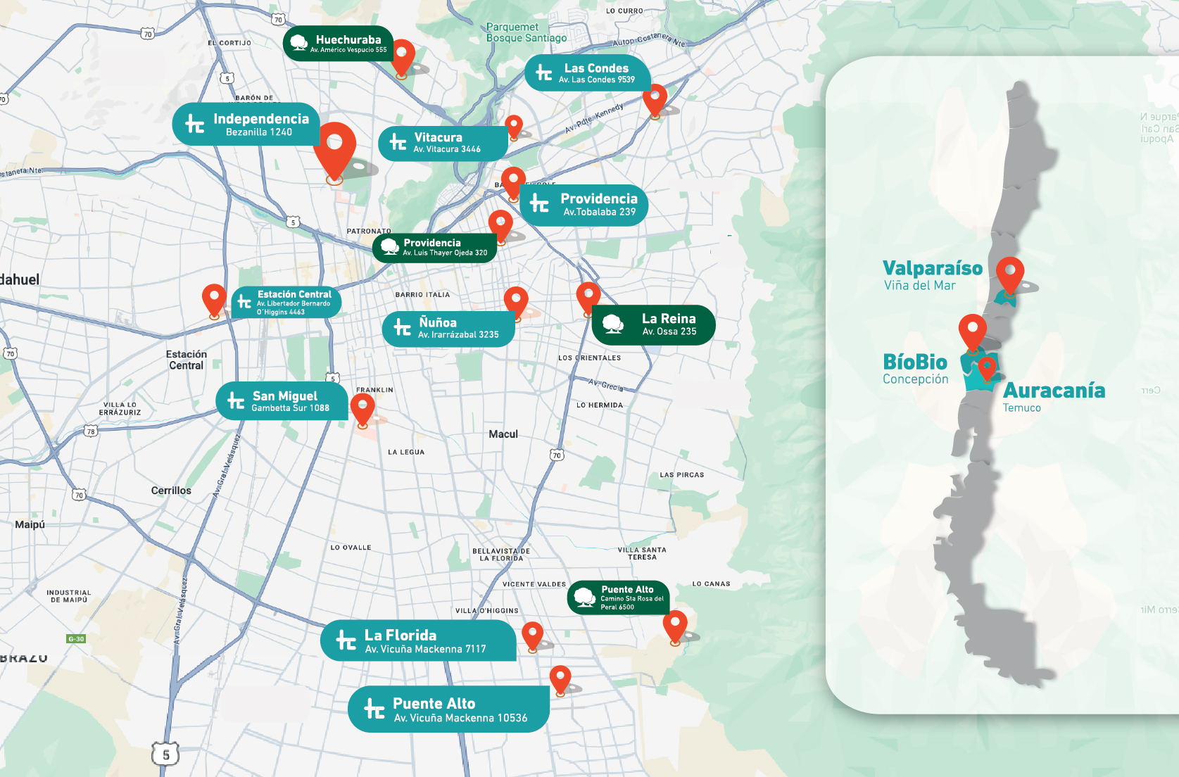 Con sucursales en la Región Metropolitana de Santiago, Viña del Mar, Temuco y Concepción, contamos con más de 16 oficinas en todo Chile, para estar siempre cerca de ti cuando más lo necesites.